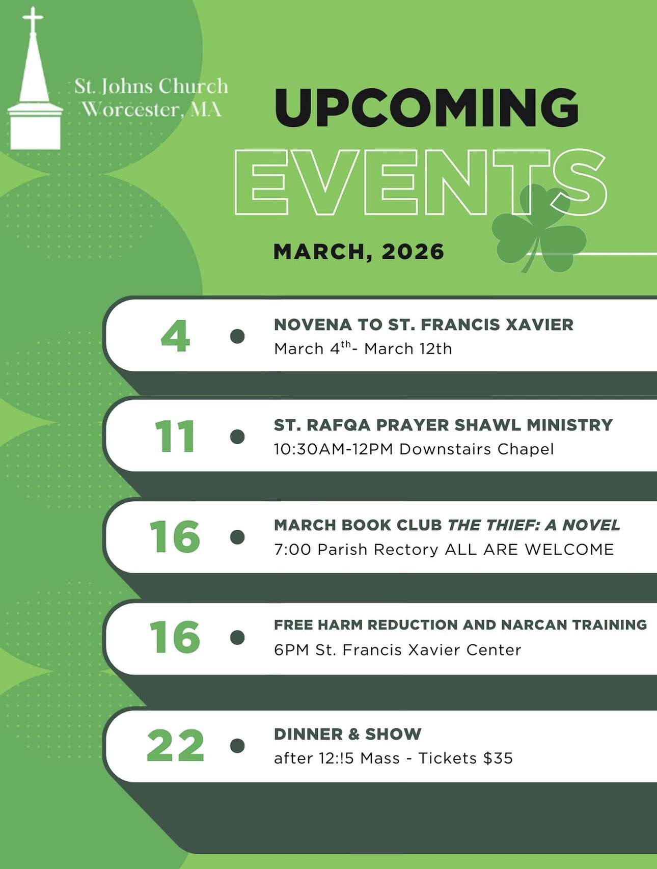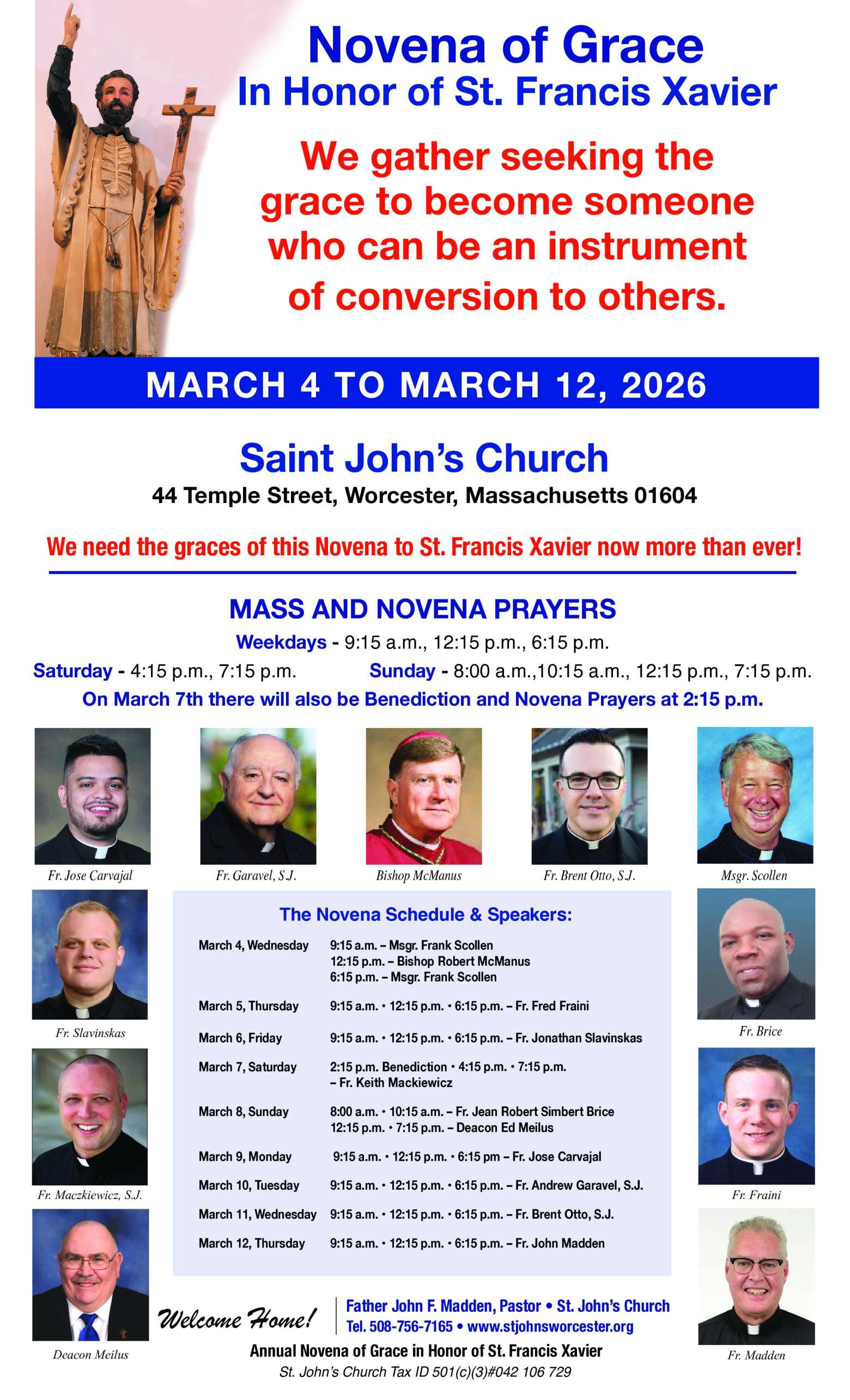 We are blessed to begin the Novena of Grace in honor of St. Francis Xavier tomorrow, March 4, and continue through March 12. We invite everyone to join us in prayer as we seek God’s grace and grow together in faith. Please see the attached flyer for Mass and Novena times and other upcoming parish events. We look forward to praying with you. God bless.